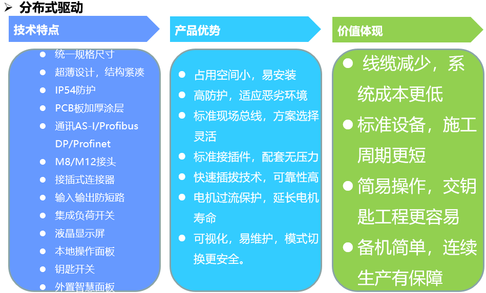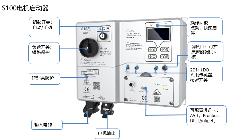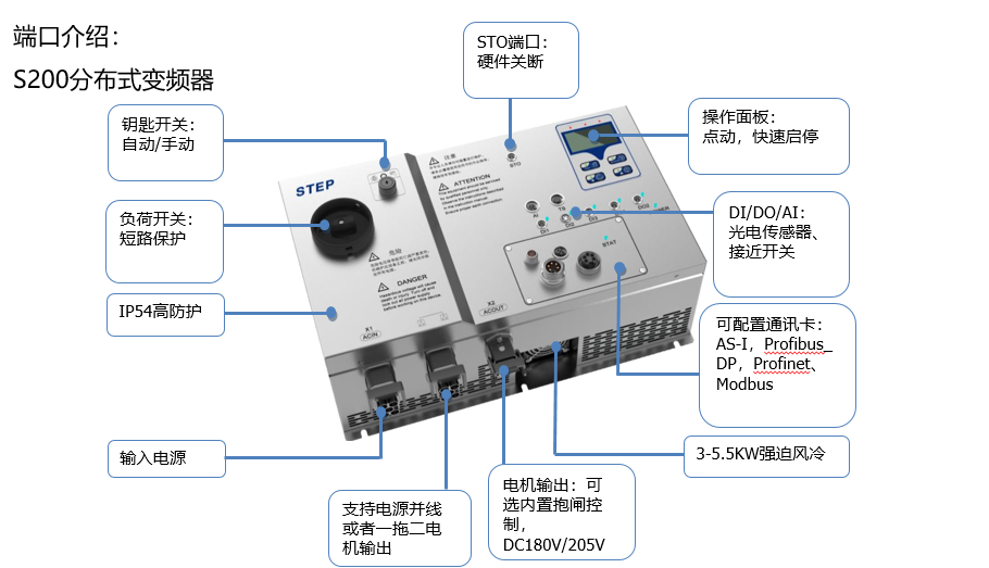 智能电机启动器S100和分布式变频器S200是专门针对工业环境中的输送技术应用而设计的,具备通讯功能,也可以I/O进行控制,非常适用于物流配送,航空港口以及各种需要分布式驱动的物流输送应用。并且特别针对基本型控制应用开发了AS-i总线连接方式,比如食品饮料和包装工业。
