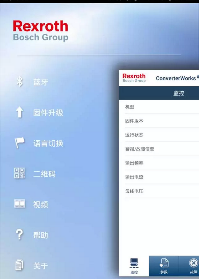 众所周知,变频器在工业领域的使用非常普遍,以往变频器调试监控都需要配合使用基于PC机的上位机软件,连接通信电缆,不仅要增加设备投入,还有很多耗时和不便。博世力士乐(西安)电子传动与控制有限公司的研发团队充分考虑用户体验和高效服务,经过近一年的研发设计,推出了这款与蓝牙适配器配合手持设备(手机,平板)的APP软件,彻底解决了现场的各种不便,还增加了更多人性化的功能体验——