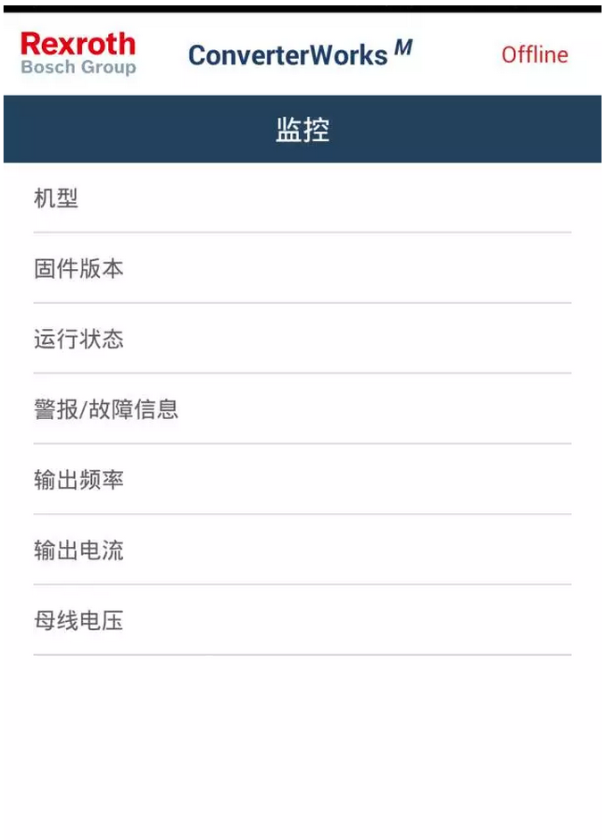 该功能基于蓝牙通讯技术,与蓝牙适配器配合使用。将蓝牙适配器插在力士乐变频器的Mini USB插口,与手机蓝牙连接成功后,即可通过ConverterWorksM APP轻松实现“监控”,“参数”,“故障”和“控制”四大基本功能,用户可根据需要进行功能选择。而一个蓝牙设备只能配对一个手持设备也让用户无需为数据安全担忧。